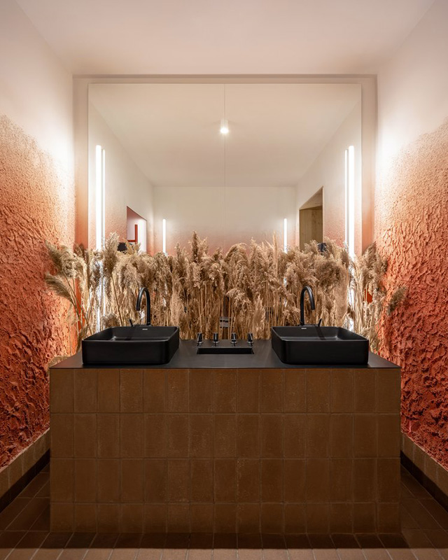 餐厅的墙壁,地板和家具均以淡红色调装饰,配以一簇簇红色——一种通常用于制作传统乌克兰绣花衬衫的配色方案。大餐桌和长椅的设计灵感来自于旧的室内设计,但是它的白色装饰和干净的线条使它融入了新的现代环境。