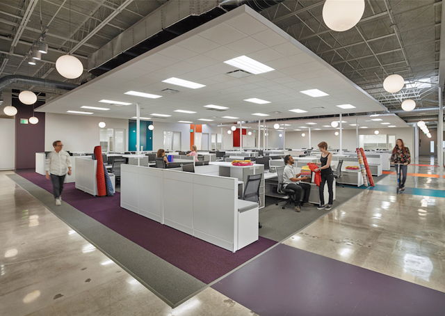 对于valley forge 公司的制造部门,stantec采用了中性色调设计,因为这是公司的核心部门,并且中性色调可制造出空间延伸感。办公和协作区域采用灰色白色与紫色穿插,以及红色,橙色,紫色和孔雀绿等颜色。在实际应用中,大胆连续的彩色条纹从视觉上分隔了大的公共工作区域这些条纹从墙壁开始,穿过地板,地毯和任何经过的路径。